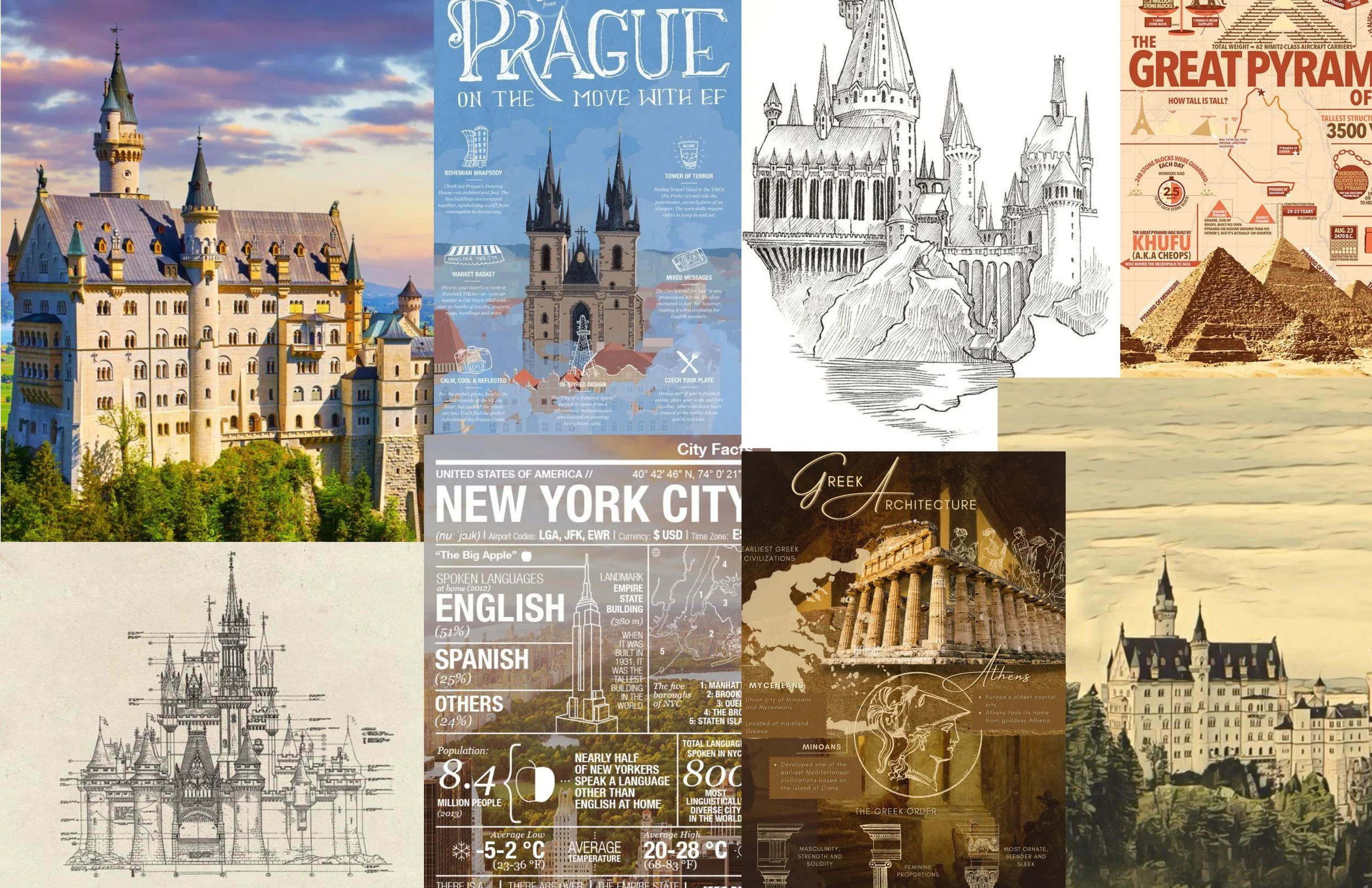 In my research of castle and landmark infographics there was a lot of focus on the landmark itself and adding elements to compliment the structures. Wanting to bring in multiple elements into the poster mood board that was put together consistent of a lot of white text and graphics to compliment complex landmarks.